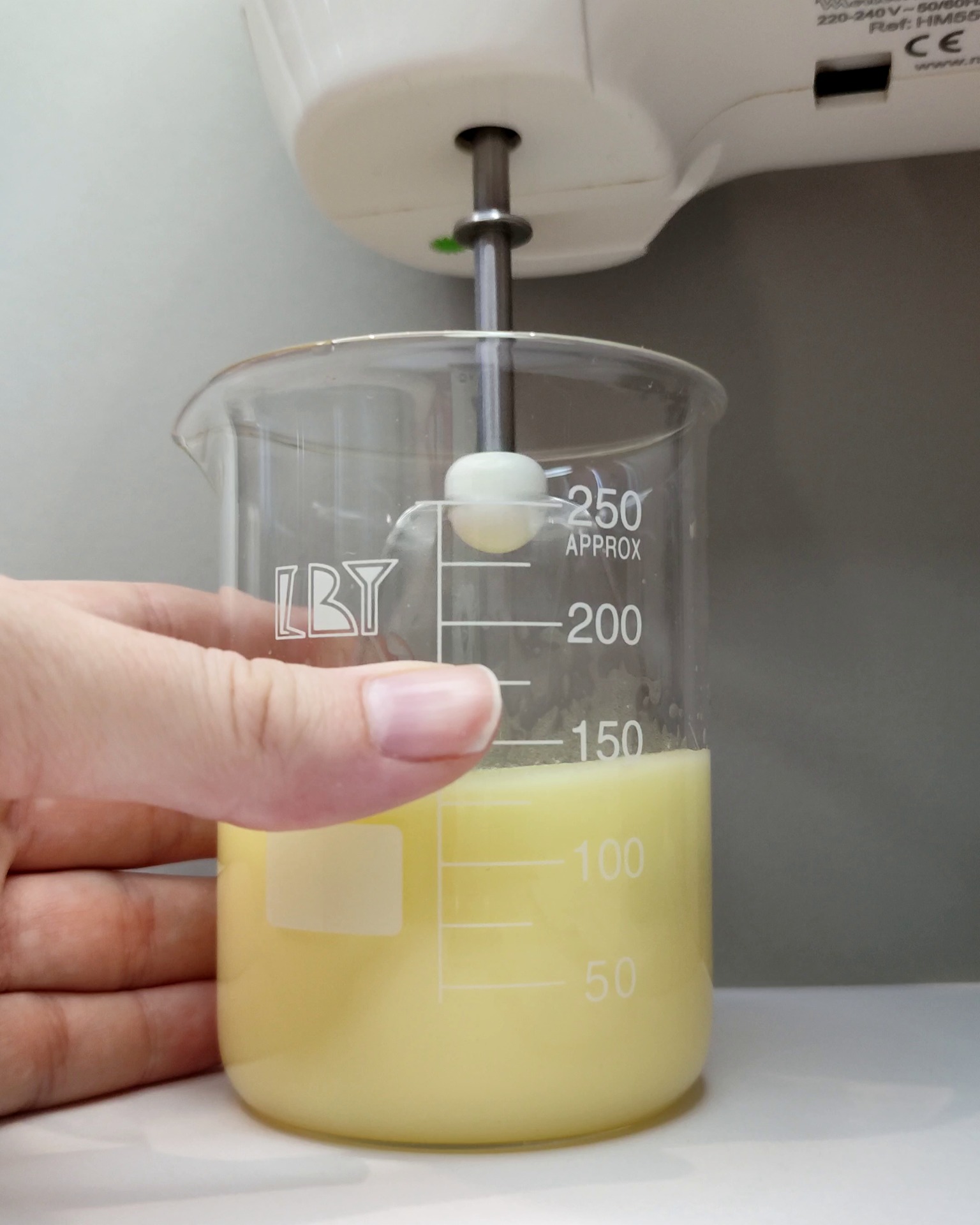 - Fluidifeel Easy dôkladne vmiešame do vodnej fázy, aby sa emulgátor rovnomerne rozptýlil v tomto vodnom roztoku.